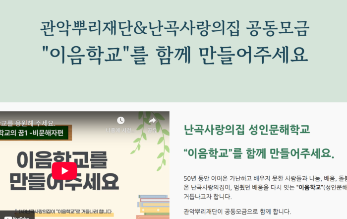 더 많은 사람들의 배움의 희망을 잇는💖난곡사랑의집 "이음학교"를 응원해주세요! 50년 동안 이어온 가난하고 배우지 못한 사람들과 나눔, 배움, 돌봄으로 함께