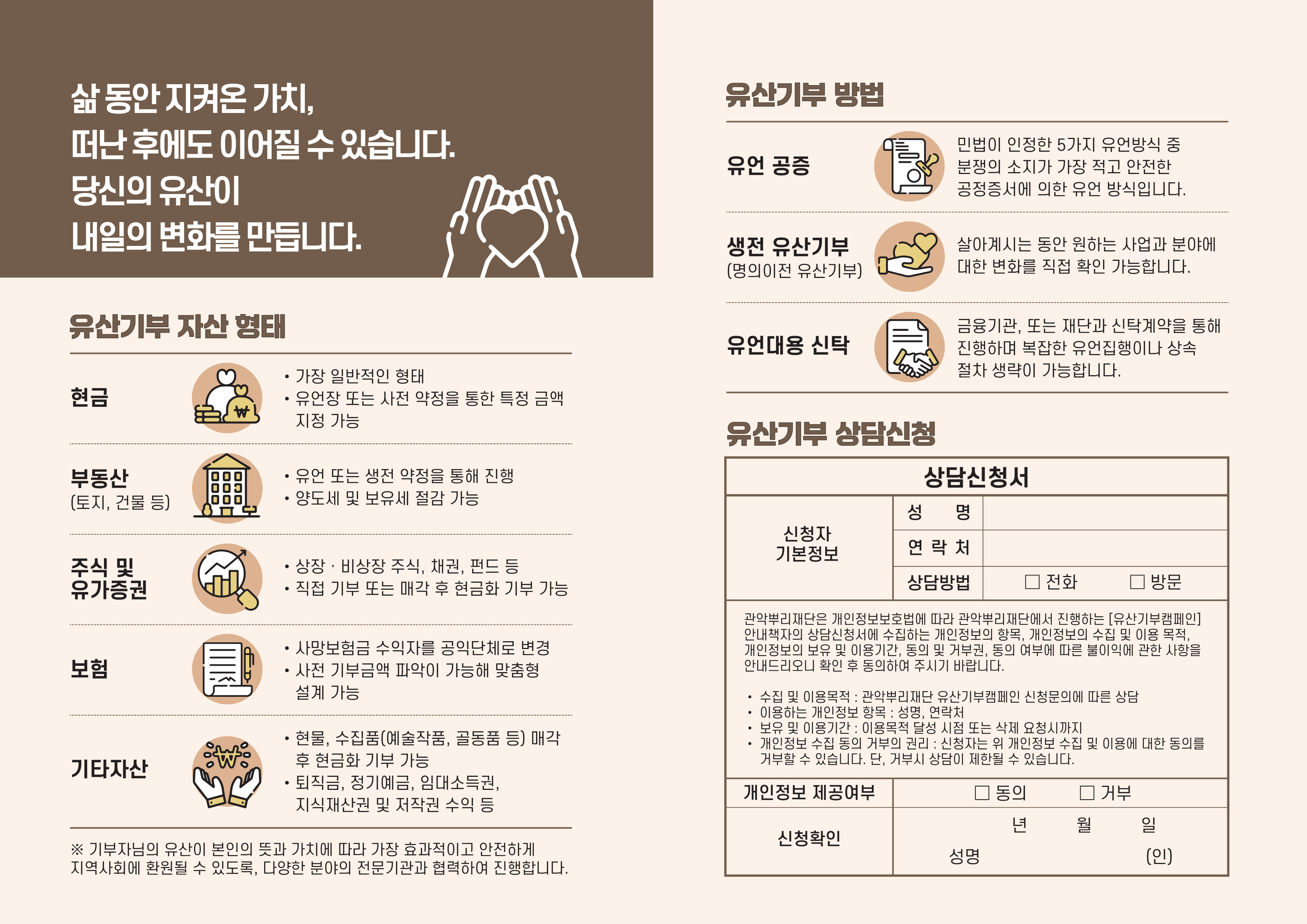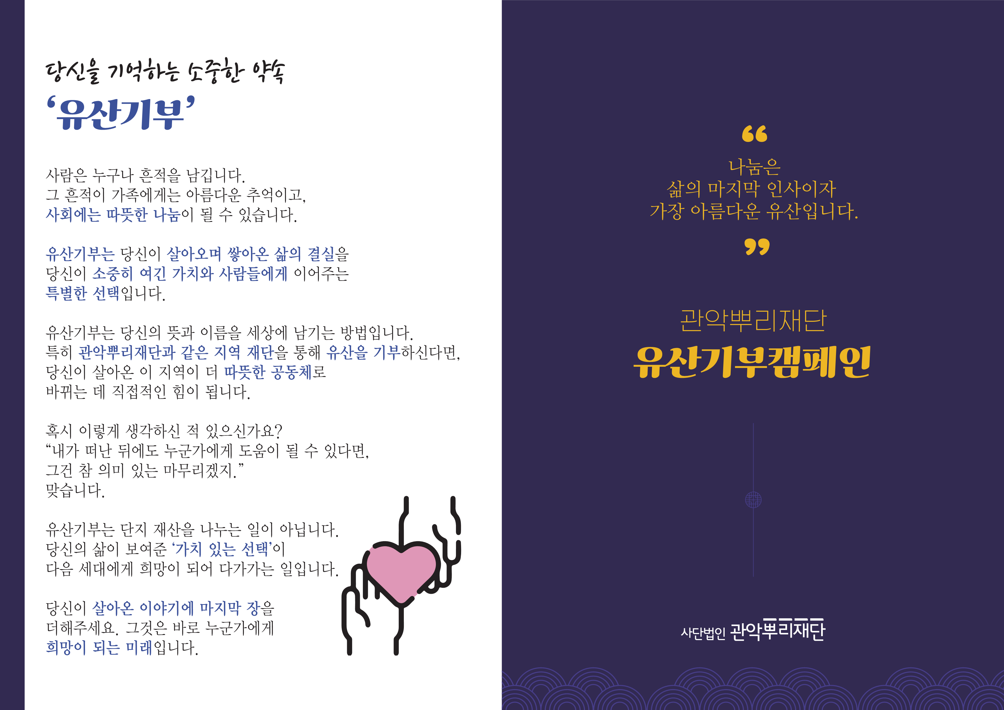 유산기부캠페인 팜플렛 2025년 기부의 날에 제작한 유산기부 안내 팜플렛입니다. PDF 파일 다운로드 garoot2026-01-28T23:44:25+09:00 관련 글 공익활동단체 현황에 관한 연구 – 관악구 지역을 중심으로 2025-09-17 | 0 댓글 뿌리생각 (관악뿌리재단 뉴스레터 여는글 엮음) 2025-07-17 | 0 댓글 2024 연간보고서 2025-04-07 | 0 댓글 2025년 정기총회 자료집 2025-03-11 | 0 댓글 2024년 정기총회 자료집 2024-03-11 | 0 댓글 2023년 정기총회 자료집 2023-03-09 | 0 댓글 2022년 관악뿌리재단 소개서 2022-09-07 | 0 댓글 2022년 관악뿌리재단 정기총회 자료집 2022-02-23 | 0 댓글 관악뿌리재단 백서 ‘1주년 자료집’ 2022-02-17 | 0 댓글 2021 관악뿌리재단 정기총회 활동보고 영상 2021-04-19 | 0 댓글